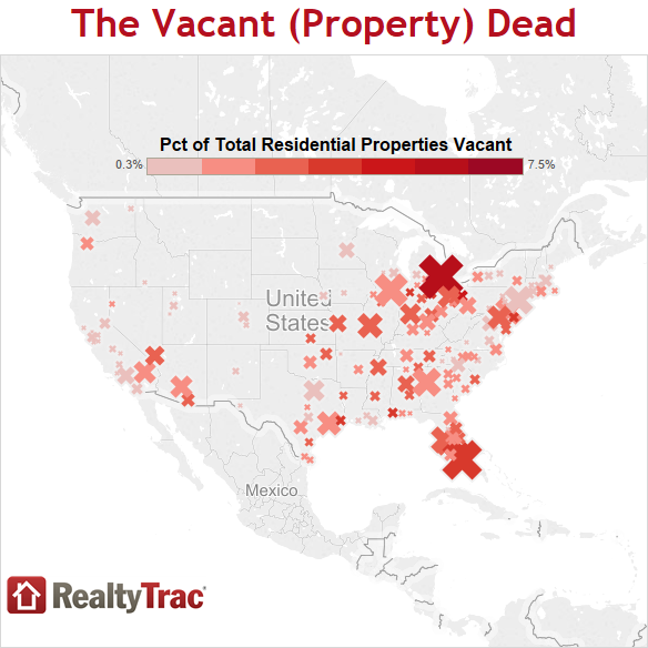 “The overall inventory of homes in the foreclosure process has dropped 36 percent over the past year so it’s not too surprising to see a similarly dramatic drop in vacant zombie foreclosures,” said Daren Blomquist, vice president at RealtyTrac. “What is surprising is there are so many vacant homes where the homeowners do not appear to be in financial distress — with only 3 percent in foreclosure or bank owned, and only 6 percent that are underwater. More than 63 percent of these vacant homes are not even encumbered by a loan, owned free and clear by the owner. The fact that the homeowners are not selling given the recovering real estate market in most areas indicates that many of these properties are in poor condition and in neighborhoods that have been left behind by the housing recovery.”